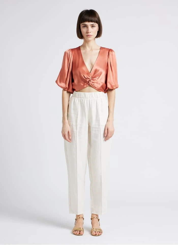 Dit model wordt aangeboden met Carrotbroek linnenblend by LAB DIP, Hoge, glanzende, leren sandalen by RIVECOUR