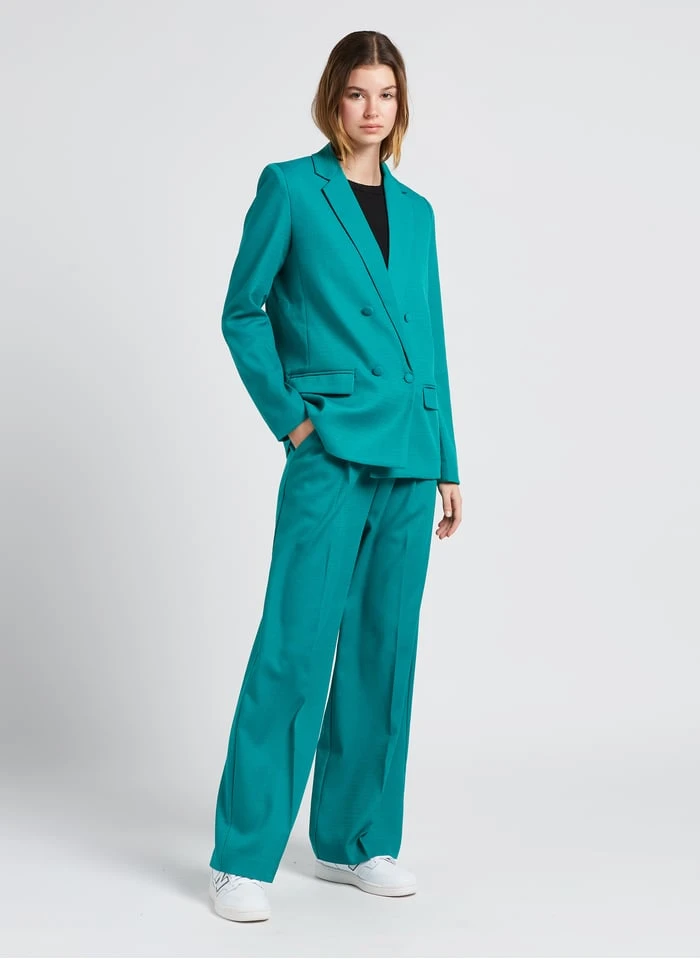 Dit model wordt aangeboden met Body met ronde hals en ribbeltextuur by GRACE ET MILA, Wijde bandplooibroek met hoge taille by GRACE ET MILA, Lage sneakers van gemengd leer by NEW BALANCE
