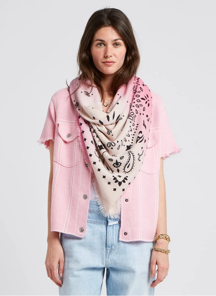 Dit model wordt aangeboden met Katoenen singlet met ronde hals by PETIT BATEAU, Boyfriend-jeans van gerecycled katoen met hoge taille by CLOSED, Platte, leren sandalen by BERENICE, Sjaal van kasjmier met print by KUJTEN