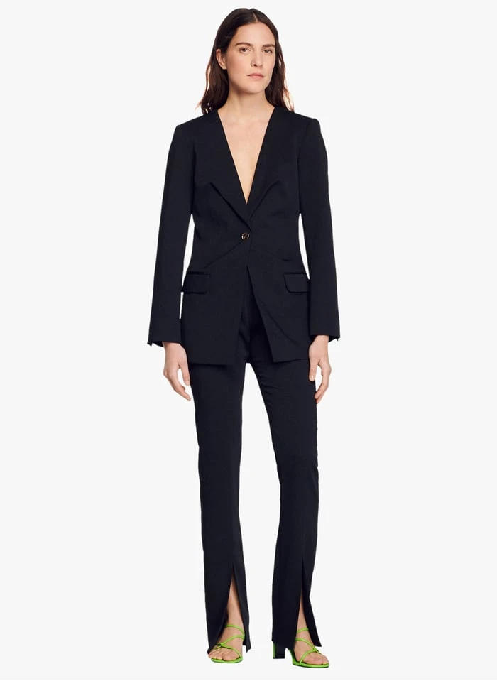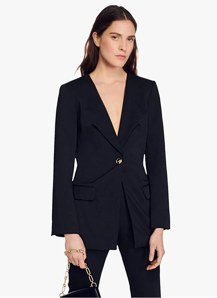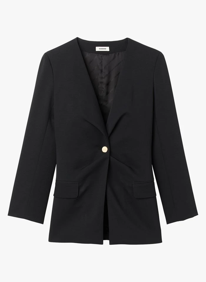 - Veste cintrée et drapée, munie d’une encolure en V, de poches horizontales à rabat et de manches longues.