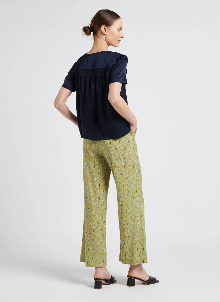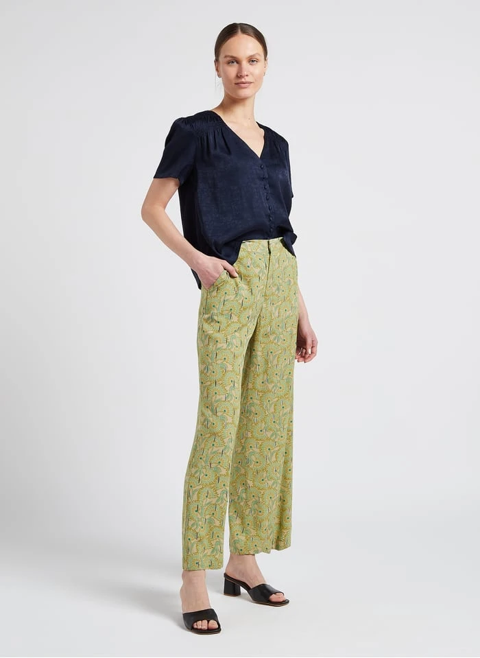 Dit model wordt aangeboden met Soepelvallende broek met bloemmotief by SEE U SOON, Leren sandalen by MELLOW YELLOW