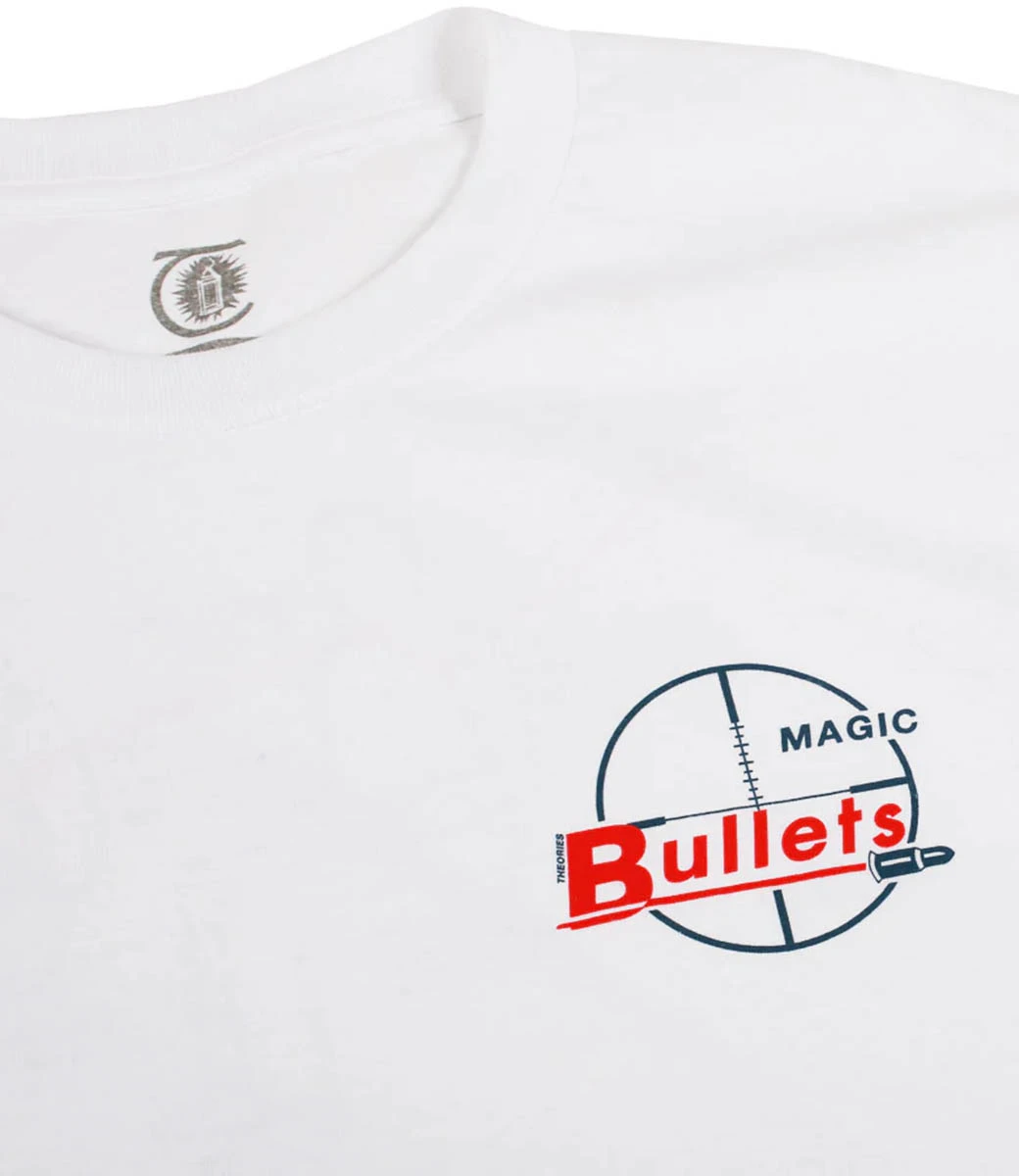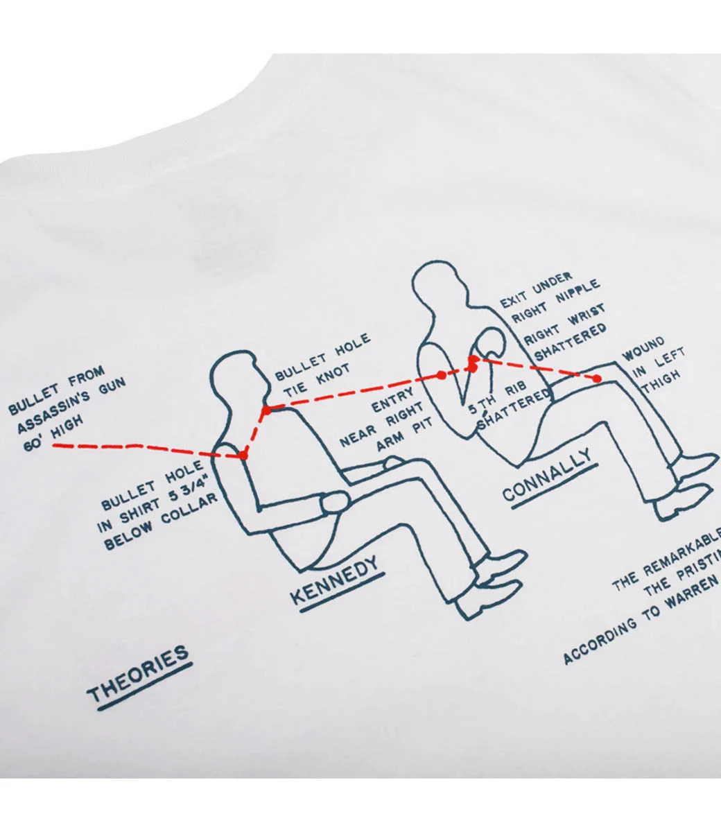 Was het de Magic Bullet die JFK te pakken kreeg? Een terugkerende favoriete graphic van Theories Brand op een T-shirt van 100% wit katoen met een klassieke skatepasvorm.Â